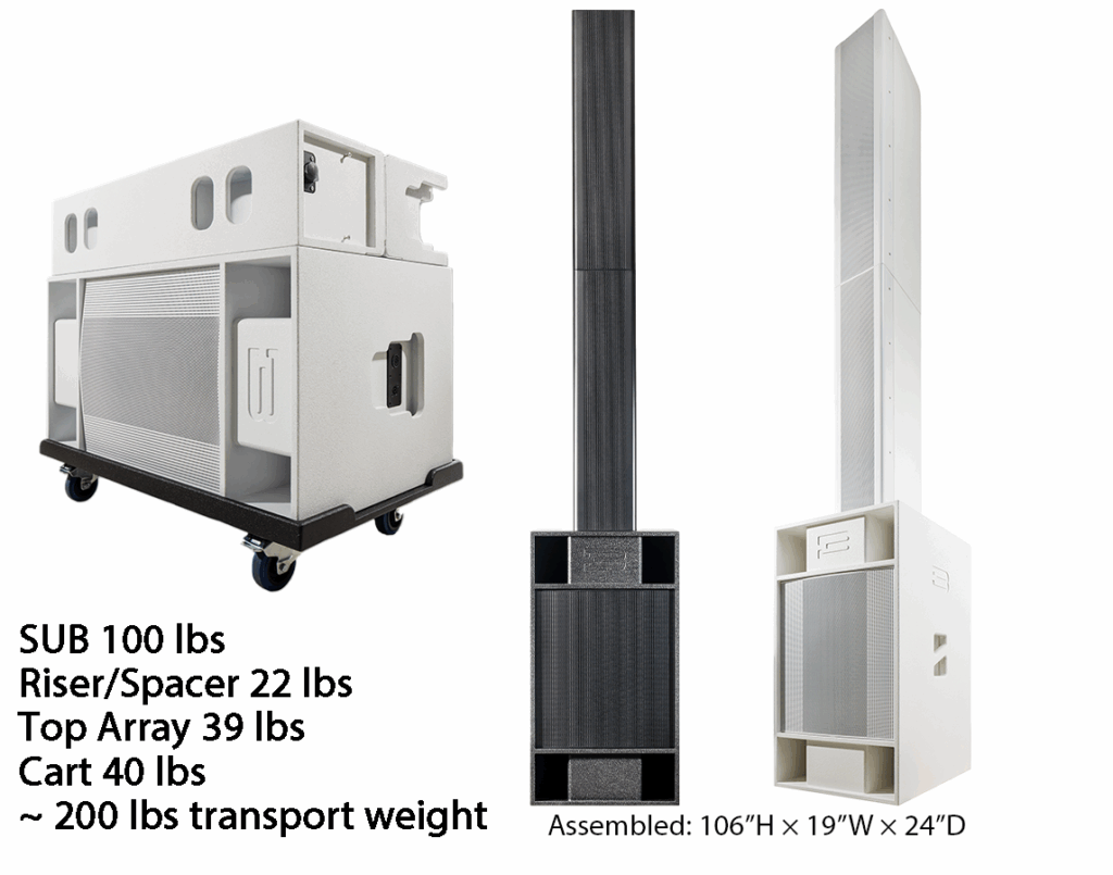 BASSBOSS designed this system for real-world efficiency. The included dolly cart makes transport and setup a one-person job. Each column section locks cleanly into place, and the cabling is neatly routed through the “Elevator” section with built-in cable storage.