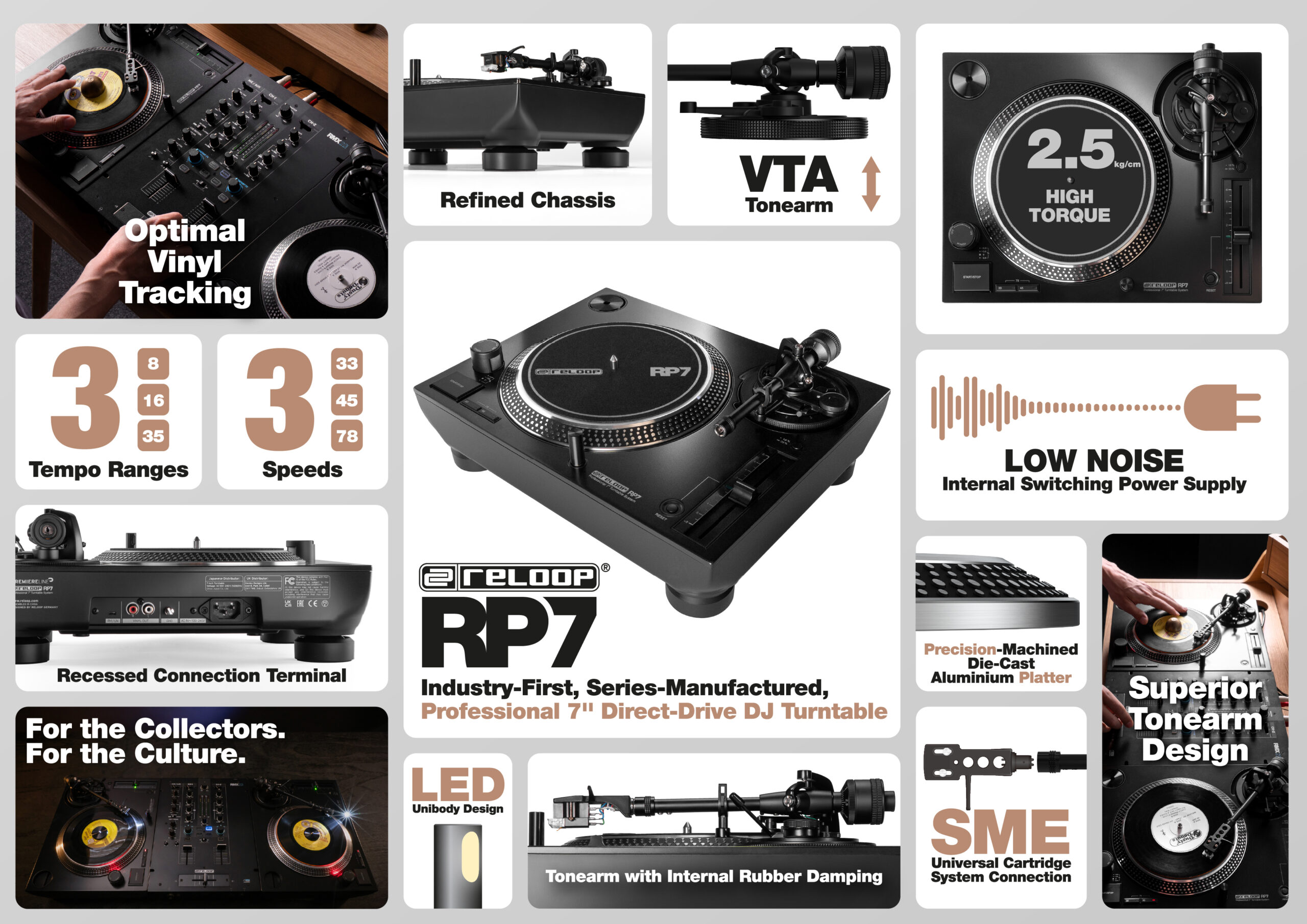 Reloop RP-7 feature overview infographic highlighting specs like high torque, VTA tonearm, recessed connections, and compatibility with 3 tempo ranges and speeds — designed for 7-inch vinyl performance and 45 culture.