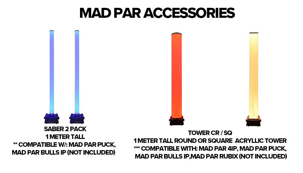 MAD PAR accessories the thin saber 2 pack next to the larger round and square columns height and compatibility text