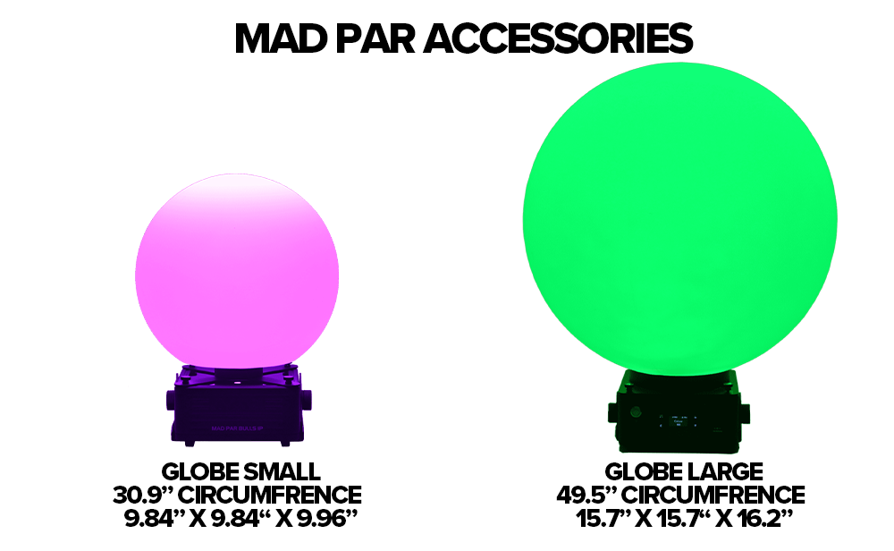 • MAD PAR Globes (S/L): Snap-on spherical diffusers for soft ambient lighting in photo or event setups.
